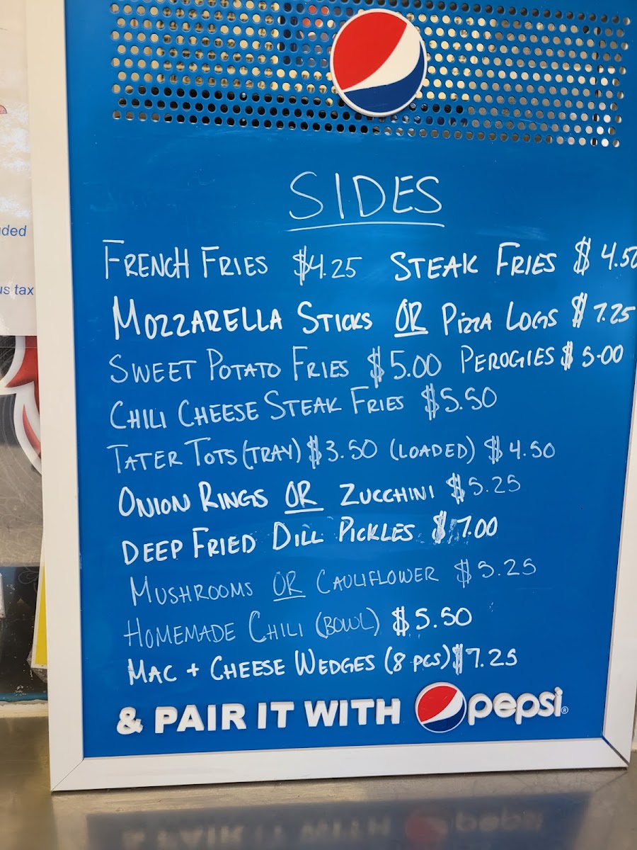 Sides include crave-worthy options like Chili Cheese Steak Fries, Sweet Potato Fries, and Tater Tots (Tray)-each great for sharing or pairing with your main. Beverages range from Coffee and Tea to indulgent shakes like the Super Giant Milkshake, making this spot perfect for cooling down on a summer day.